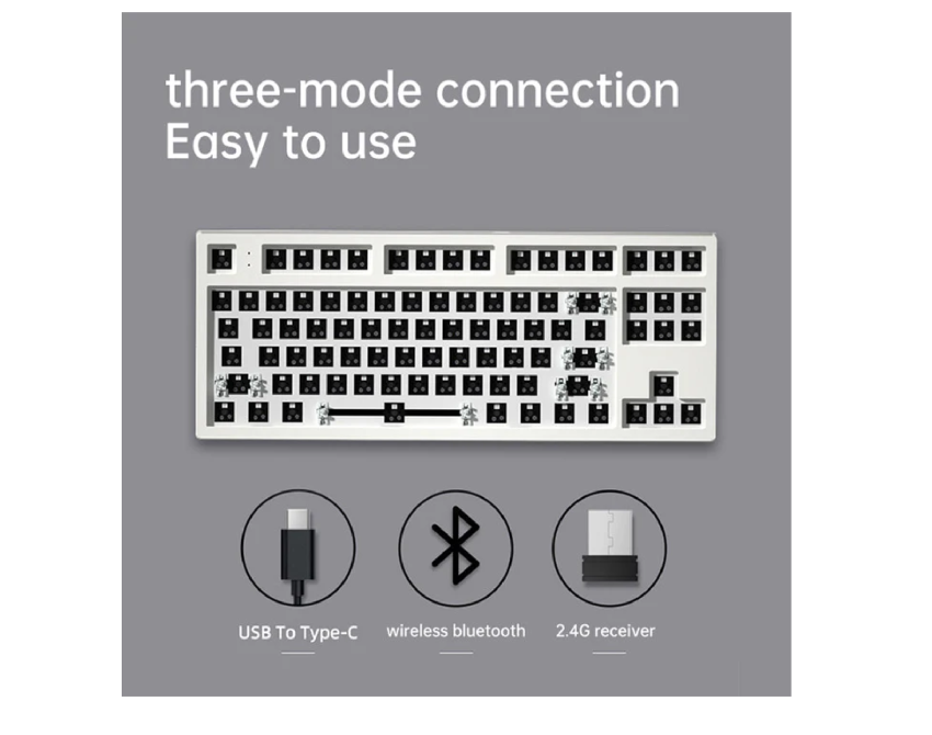 Layout: 80%, 87 Keys (TKL) Programmable: Support Switch Socket: Kaih Hot-swappable Socket Stabilizers: Pre-lubed, Plate-mounted Stabilizers Backlight: South-facing RGB Connectivity: USB-C / 2.4G Wireless / Bluetooth System: Windows 7/8/9/10/11/ macOSX Anti-ghosting: Full Keys Anti-ghosting |