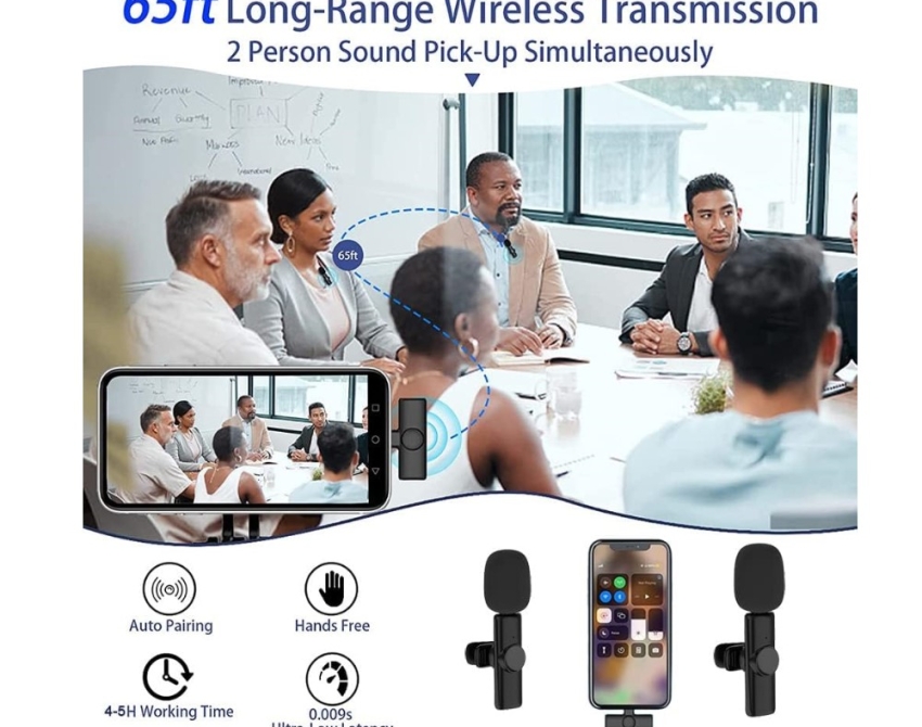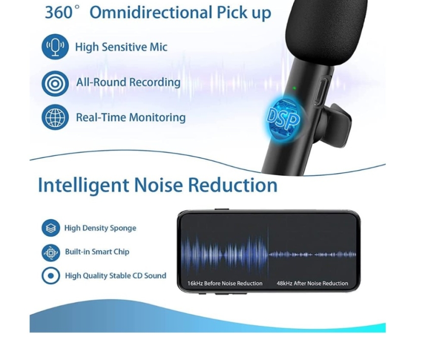 - Simply connect the receiver to your smartphone - 360 degree surround sound - Superior noise reduction - Style: tie-clip microphone - Connectivity: wireless - Compatibility: Android - Transmission distance: 20 m - Input voltage: DC 4.8-5V - Frequency range: 2.4 GHz - Frequency range: 20-20 KHz - Interface: Type-C - Color: Black