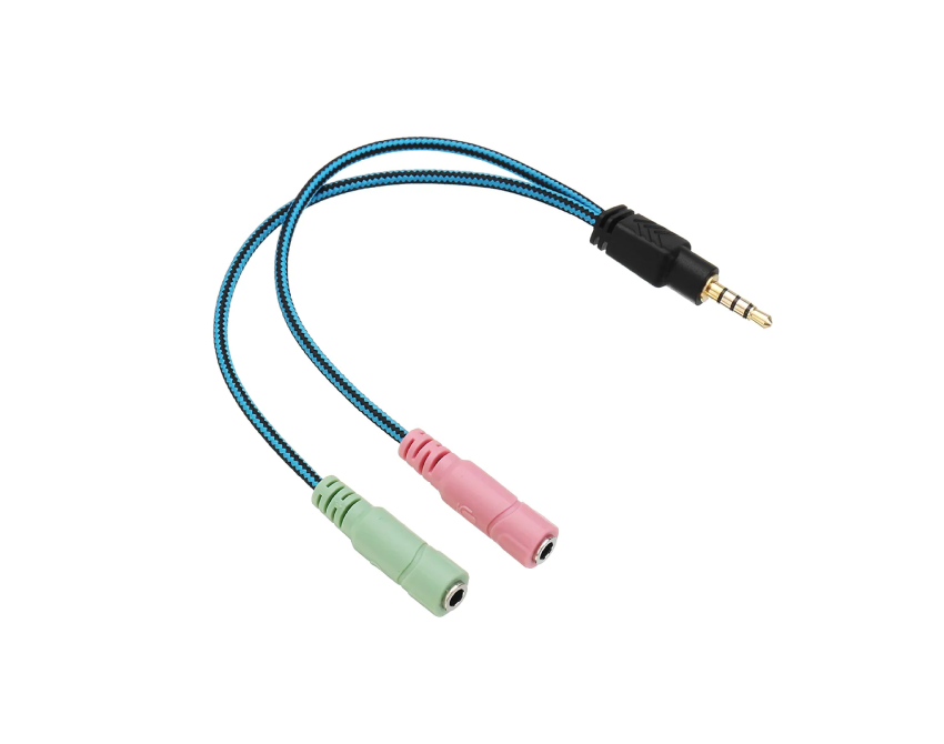 Converts single audio and mic jack to separate jacks for audio and mic.