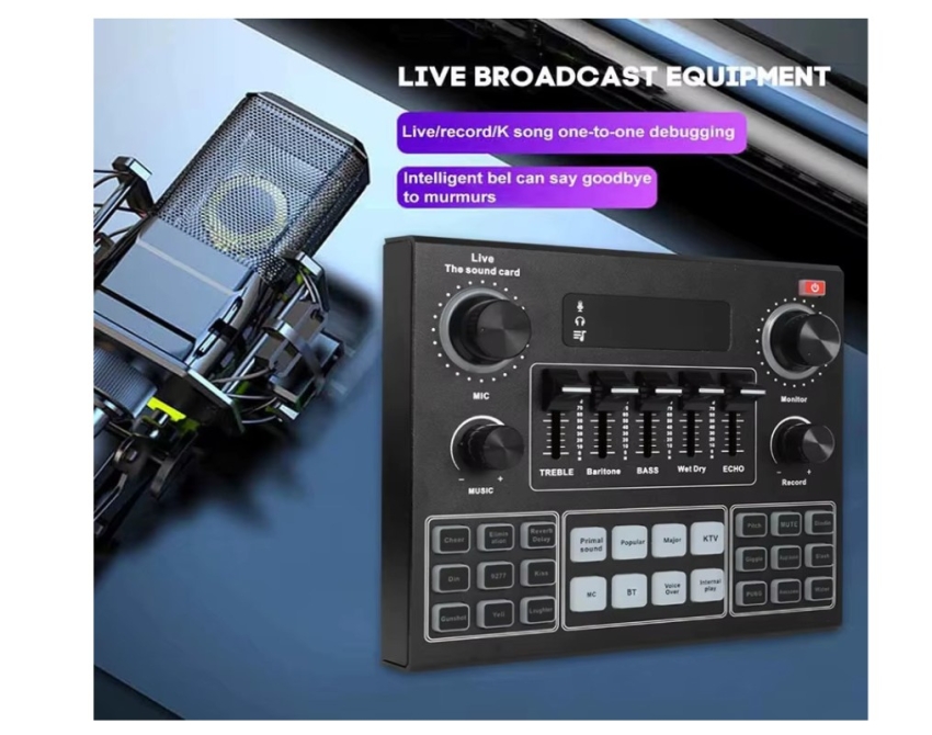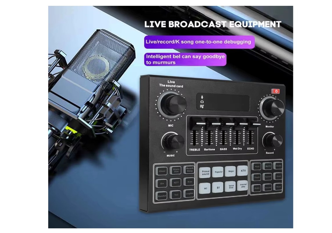 -12live effects, 12 electronic music effects, 14 pre-heating sound effects, the live sound card supports the elimination of origin sound,male voice, female voice, baby voice and a variety of voices.