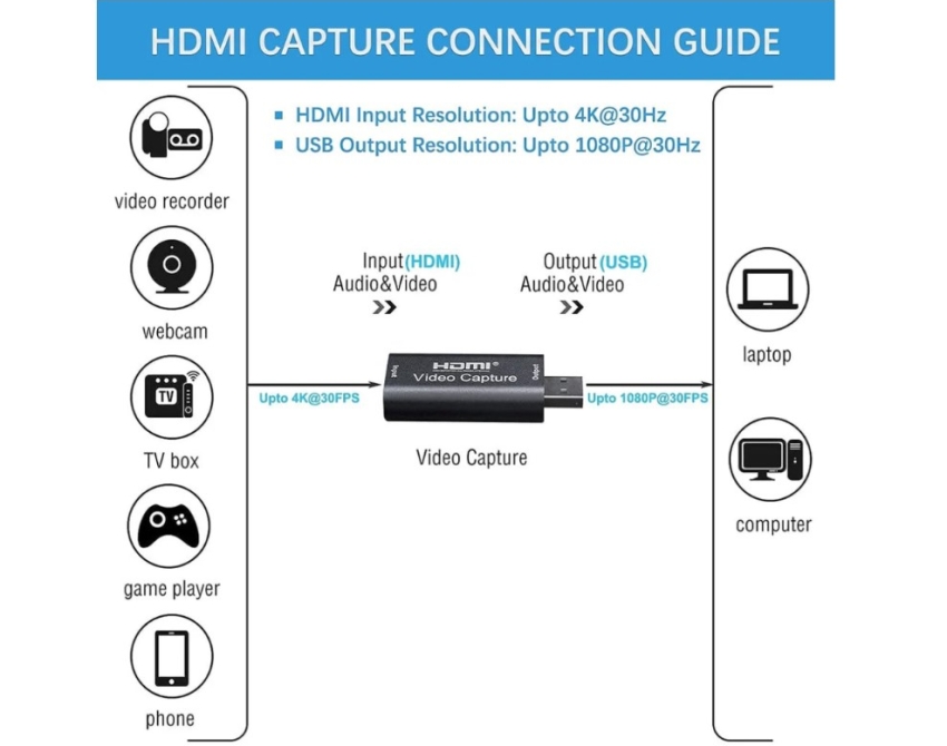 · Input resolution 3840×2160@30Hz · output resolution 1920×1080@30Hz · Interface: USB 2.0 · Video output format: YUV/JPEG · Support video format: 8/10/12bit Deep color; audio format: L-PCM · Support most acquisition software, such as VLC / OBS / Amcap, etc · Support Windows / Android / MacOS · Conform to USB Video and UVC standard; USB Audio UAC standard · Max working current: 0.4A/5V DC · Dimension (L x W x H): 64x28x13 (mm) Without external power supply, compact and portable. Easy to do live streaming, no driver needed Works with most device, such as PC,Laptop. Linux System, Mac,Camera Works with ZOOM,OBS,XBOX,Youtube,Face Live, Twitter, Twitch and more Easy Setup, just add the server host and token of your live |