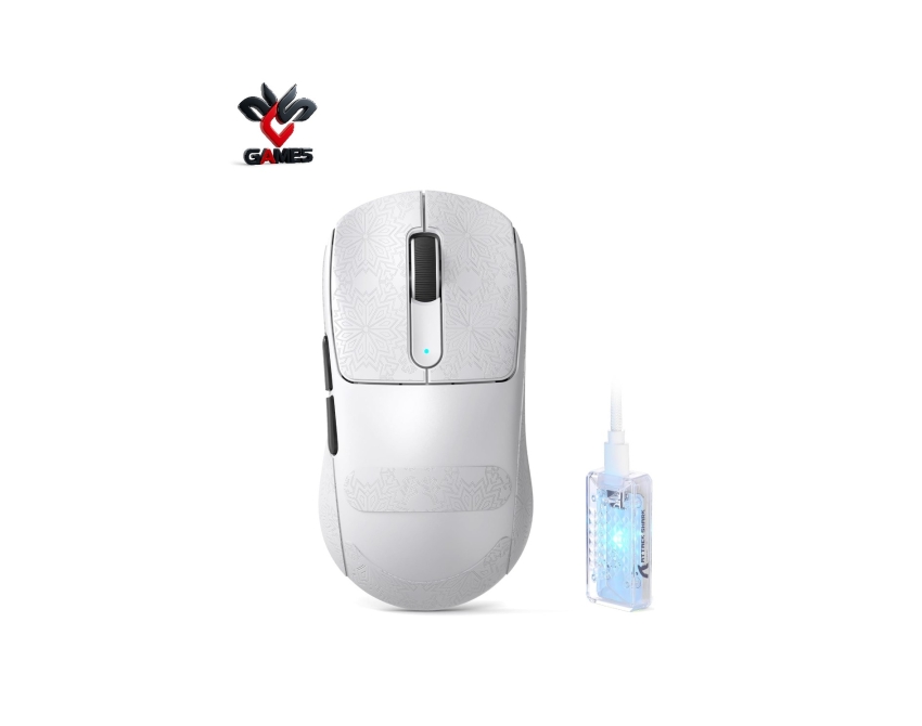 | Specifications | • Nordic 52840 MCU • PAW3950MAX Sensor • Scan Speed ≥20000 FPS • Up to 42,000 DPI • Featherlight 53g Build • Optimized for medium-to-large hands. • Omron Optical Switches – 100 million clicks • Tri-Mode Connection – Wired / Bluetooth / 2.4GHz • 8000Hz polling rate. • 500mAh High-Capacity Battery • 60G Acceleration & 750+ IPS Tracking • Transparent RGB Receiver • Dual-Layer PTFE Feet • Nano Ice-Coating |