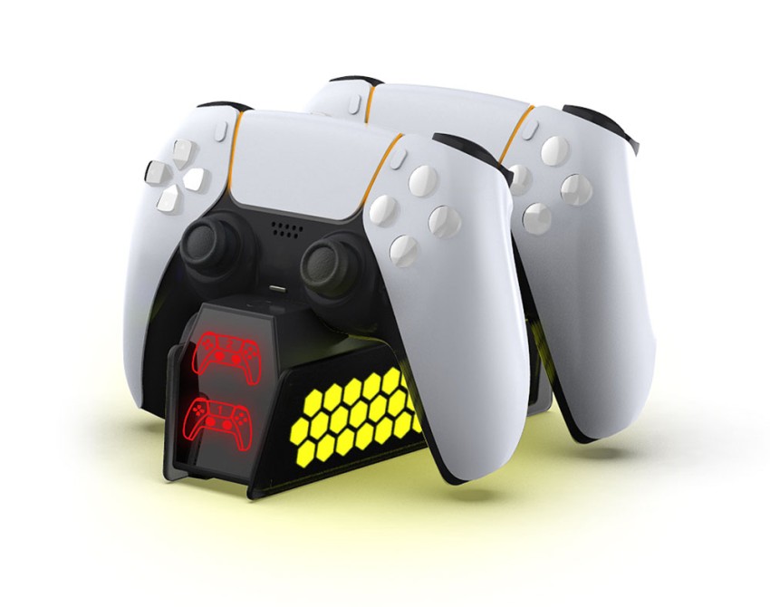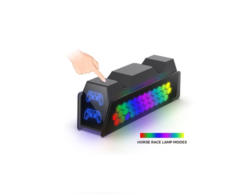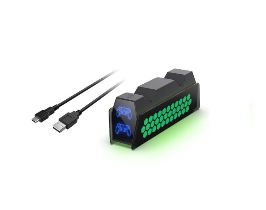 The dual charging dock, created specifically for the PS5 gamepad, incorporates colorful breathing lights to make the charging process fun